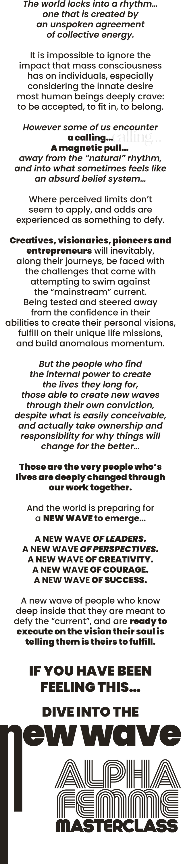 You recognize and agree that nobody and nothing part of the Alpha Femme brand has made any implications, warranties, promises, suggestions, projections, representations or guarantees whatsoever to you about future results or earnings, or that you will earn any money, with respect to your purchase of Alpha Femme programs, courses, trainings, masterclasses, mastercourses, or coaching, and that we have not authorized any such implication, promise, or representation by others. There are no guarantees of results or future earnings.